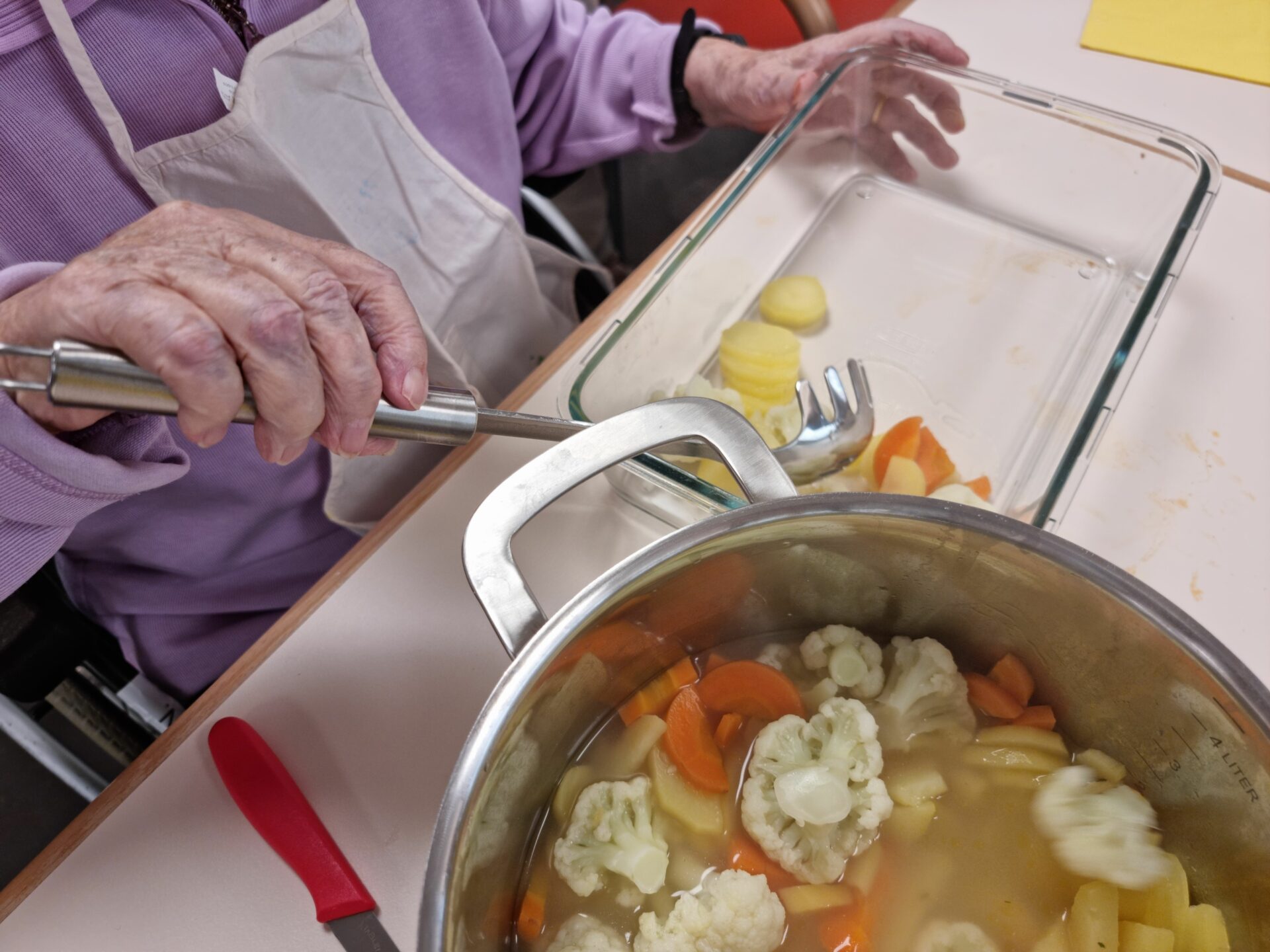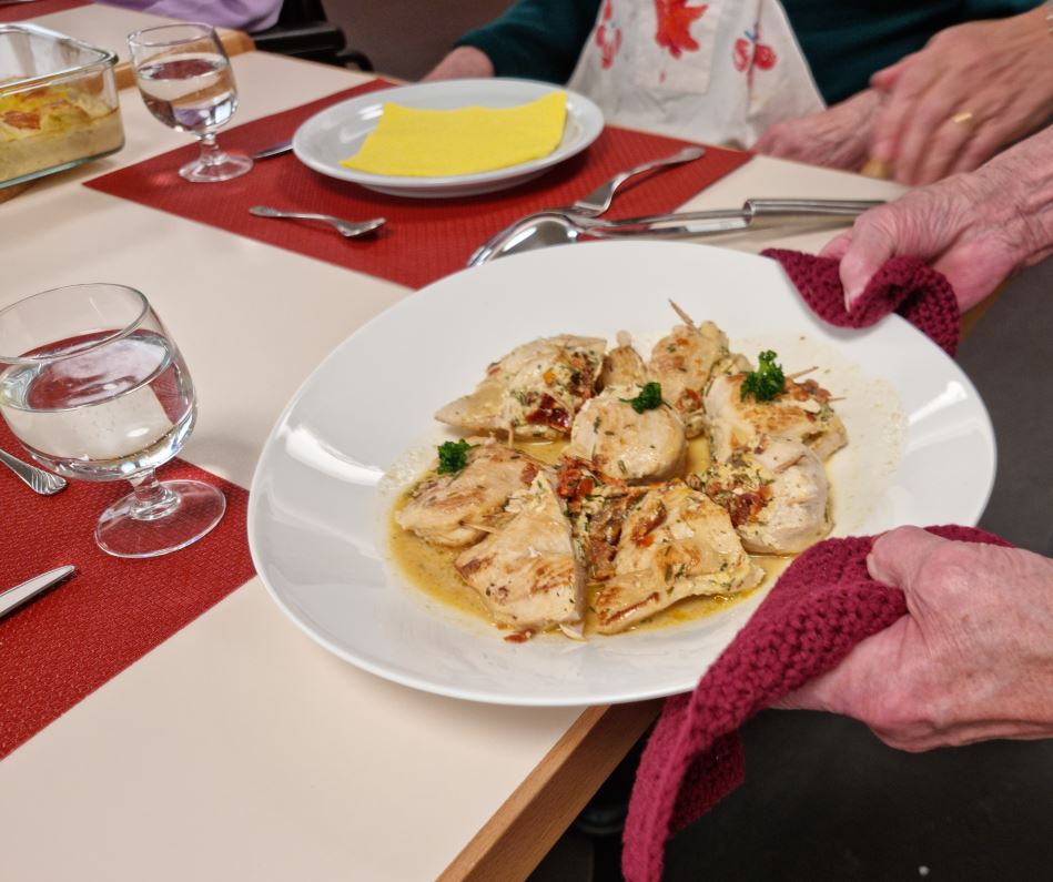 Die Bewohnerinnen und Bewohner in der Platten Meilen sind aktiv. Im Rahmen der Aktivierung kochen sie regelmässig zusammen. Unter der Anleitung der Aktivierungsfachpersonen wird ein frühlingshaftes Menu zubereitet. Die Bewohnerinnen und Bewohner bringen ihre Erfahrungen ein und freuen sich, auch neue Rezepte auszuprobieren. Heute gibt es gefüllte Pouletbrust mit einem Gemüseauflauf. Zum Dessert – und darauf freuen sich alle ganz besonders – gibt es ein Tiramisu.