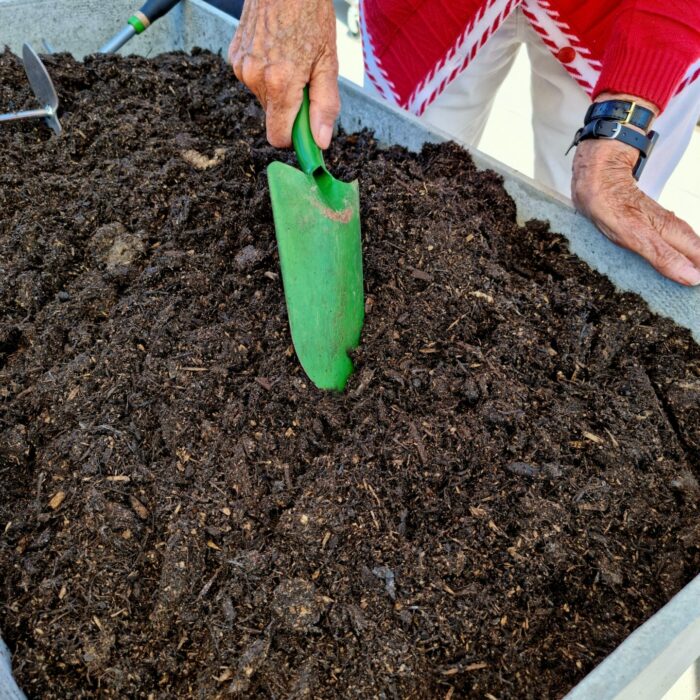 Die Bewohnerinnen und Bewohner der Demenzwohngruppe haben im Rahmen der Aktivierung auf der Terrasse einen…