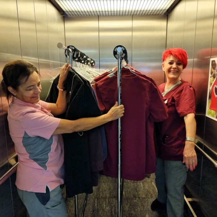 Marcia und Refika auf dem Weg in die Abteilungen mit frisch gewaschener Berufskleidung und Wäsche…