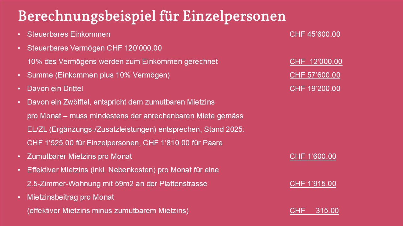 Der zumutbare Mietzins beträgt auf ein Jahr berechnet ein Drittel des steuerbaren Einkommens (Staatssteuer) plus 10% vom steuerbaren Vermögen. Davon ein Zwölftel ergibt die zumutbare Monatsmiete inkl. NK.