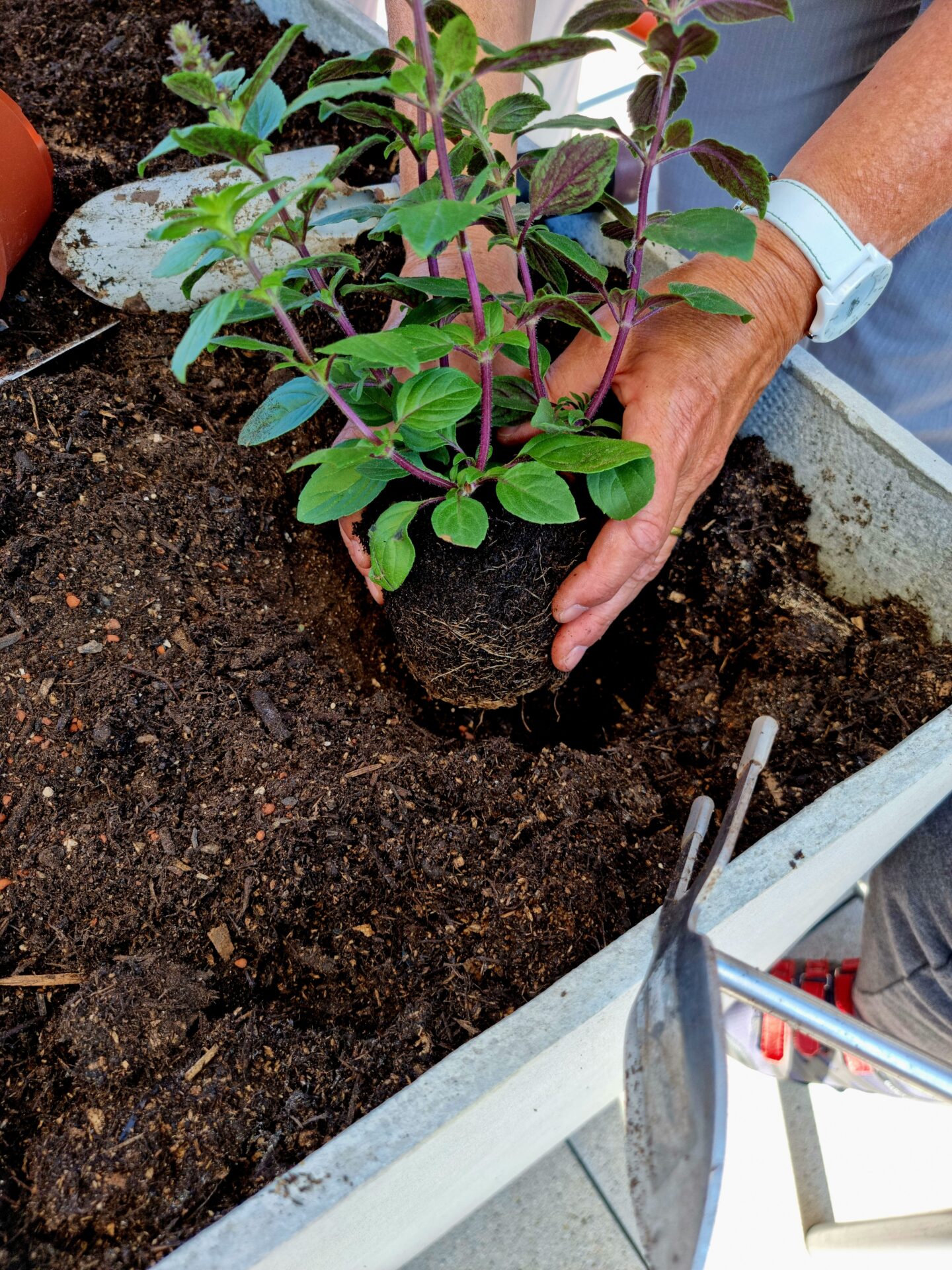 Beim Arbeiten mit Erde, Schaufel und Gartenhacke und beim Pflanzen wurden Erinnerungen wach – an den eigenen Garten oder die Blumen auf dem Balkon. Gartentipps und -erfahrungen wurden ausgetauscht. Die Bewohnerinnen und Bewohner sorgen nun zusammen mit der Aktivierung dafür, dass die Plattenküche mit frischen Kräutern versorgt wird.