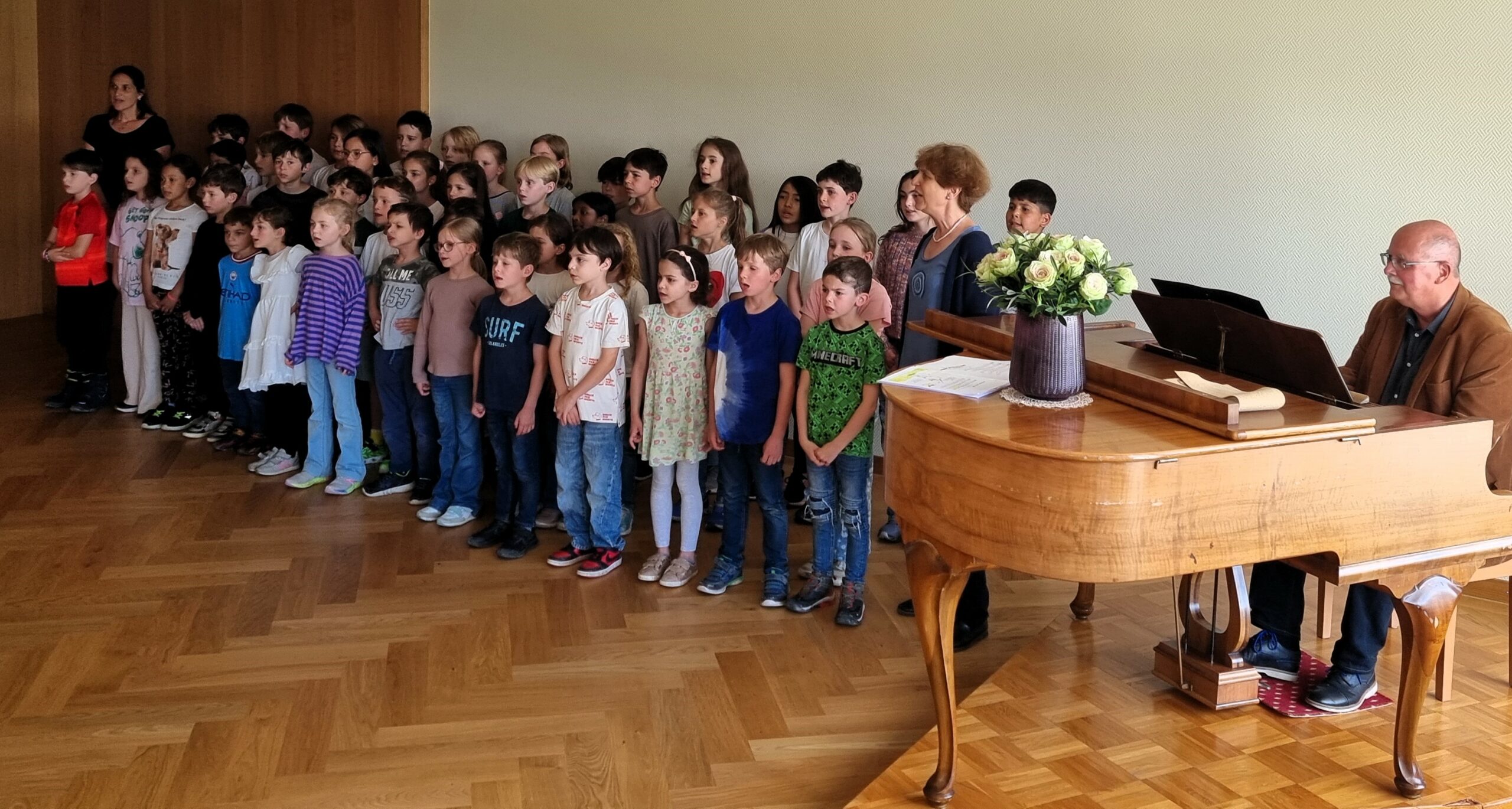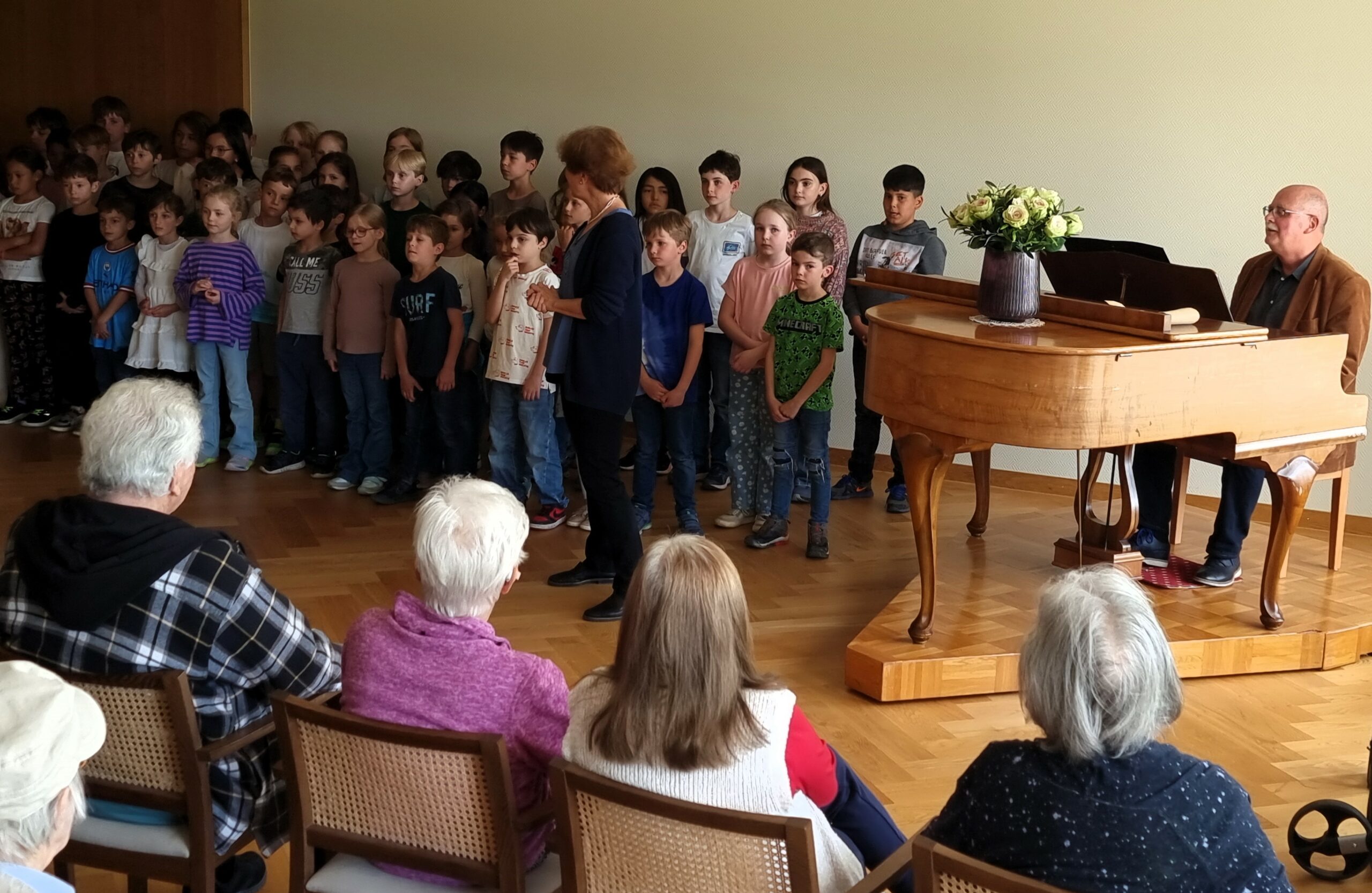 Die Bewohnerinnen und Bewohner freuten sich über die fröhlichen Lieder und sangen mit. Der Gesang der Kinder wurde am Klavier von Heinz Bösch begleitet.