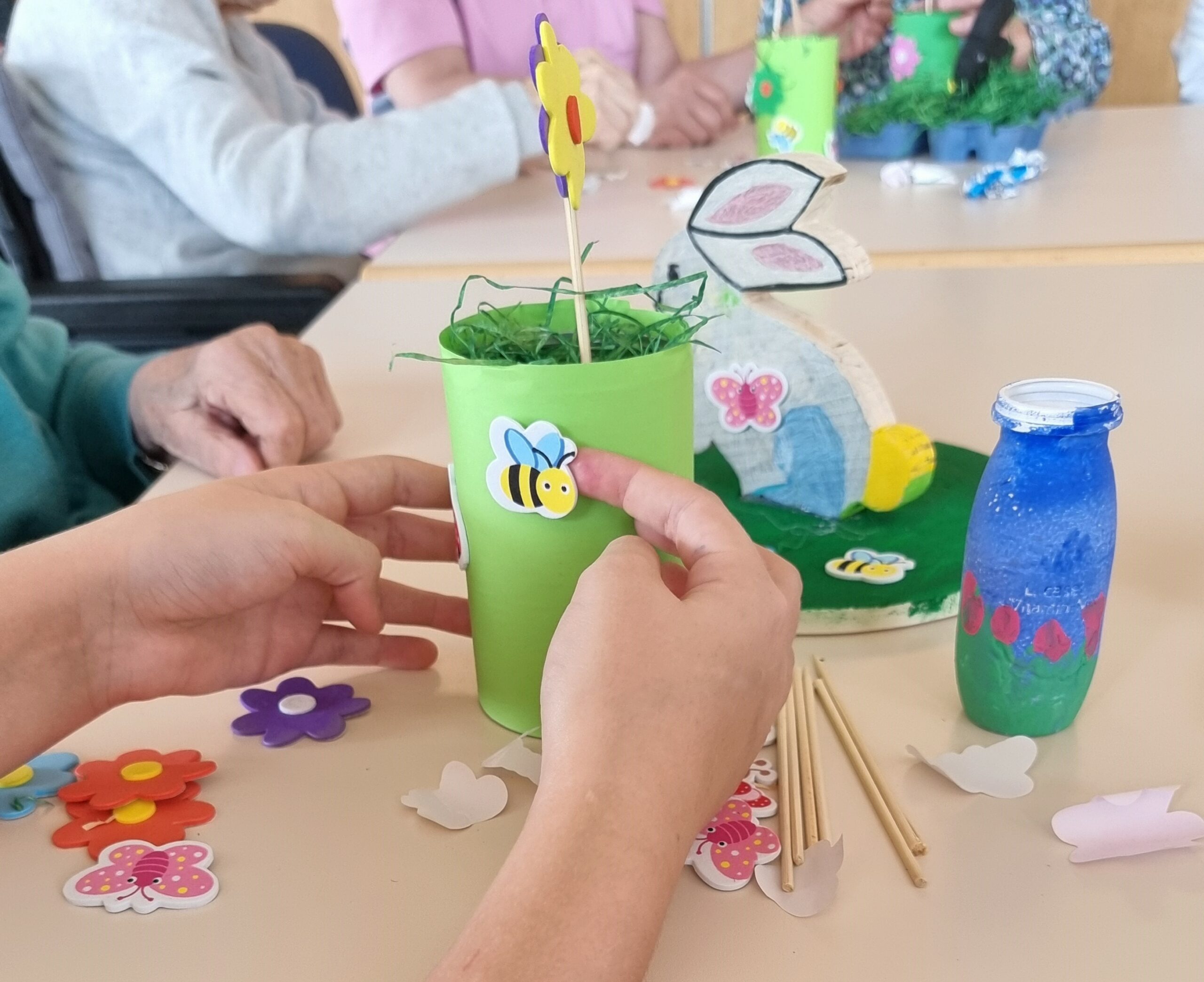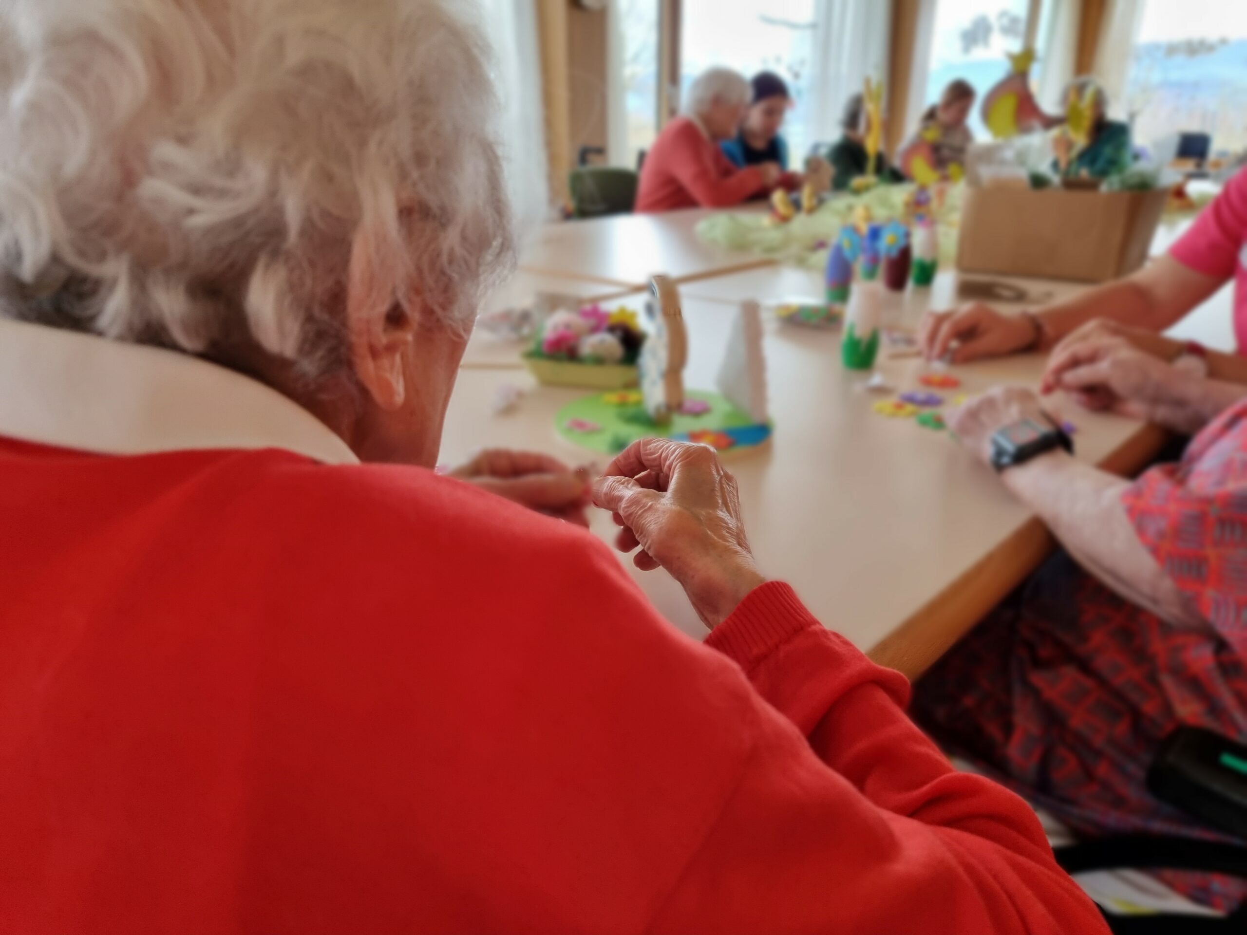 Die gemeinsam gestaltete Osterdeko wird von den Bewohnenden, den Mitarbeitenden und Gästen bewundert.